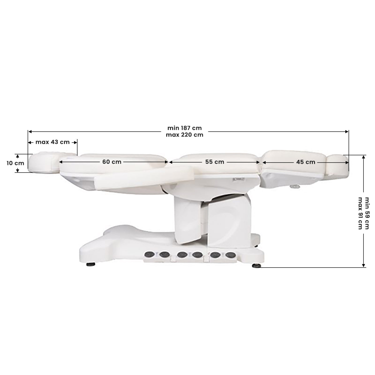 Ainulaadne elektriline kosmeetiline tool, mis sobib ideaalselt ilusalongidele ja SPA-salongidele. Tänu sõltumatutele mootoritele võimaldab reguleerida tooli 4 tasapinnas kaugjuhtimispuldi ja jalalülitite abil, andes võimaluse mugavateks näo- ja kehahooldusteks. Kaugjuhtimispuldi abil saame kasutada programmeeritud seadeid ja käivitada SOE funktsiooni, st soojenduse. Tugitool kasutab perforatsiooniga polsterdust, mis on teistes tugitoolides haruldane, ning aluse värvilist LED-valgustust.