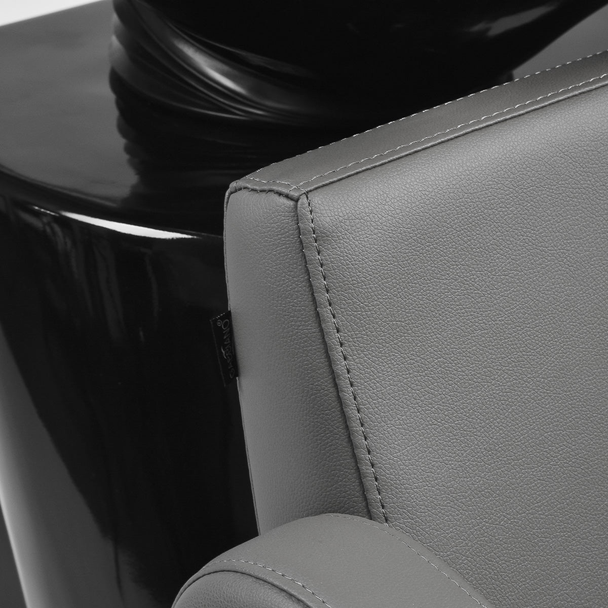 Sügav keraamiline kauss musta toonides vähendab vee ja protseduuride käigus kasutatavate toodete pritsimist. Reguleeritav kausi kalle võimaldab kohandada vastavalt individuaalsetele vajadustele ning kasutatud materjal muudab valamu vastupidavaks, plekikindlaks ja kriimustuskindlaks ning lihtsasti puhastatavaks. Ergonoomiliselt kujundatud krae tagab mugava pea toe, samas kui pehme must plastikust kate kõrvaldab keraamilise pinna külmatunde.