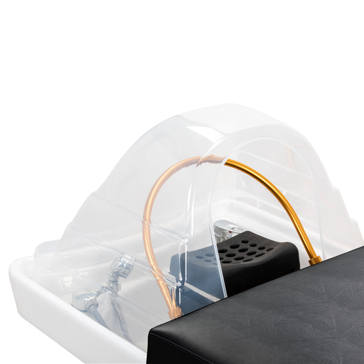 Sügav keraamiline kauss valge toonides vähendab tõhusalt vee ja hooldustoodete pritsimist, tagades töö puhtuse ja mugavuse. Vastupidavast materjalist kauss on vastupidav värvimuutustele, kriimustustele ja kahjustustele ning selle sile pind teeb puhastamise erakordselt lihtsaks. Eriline profiil hõlbustab mitte ainult teenuse osutaja ligipääsu, vaid annab pesuasemele elegantse ja kaasaegse välimuse. Esteetika ja funktsionaalsuse kombinatsioon tõstab iga professionaalse ruumi taset.