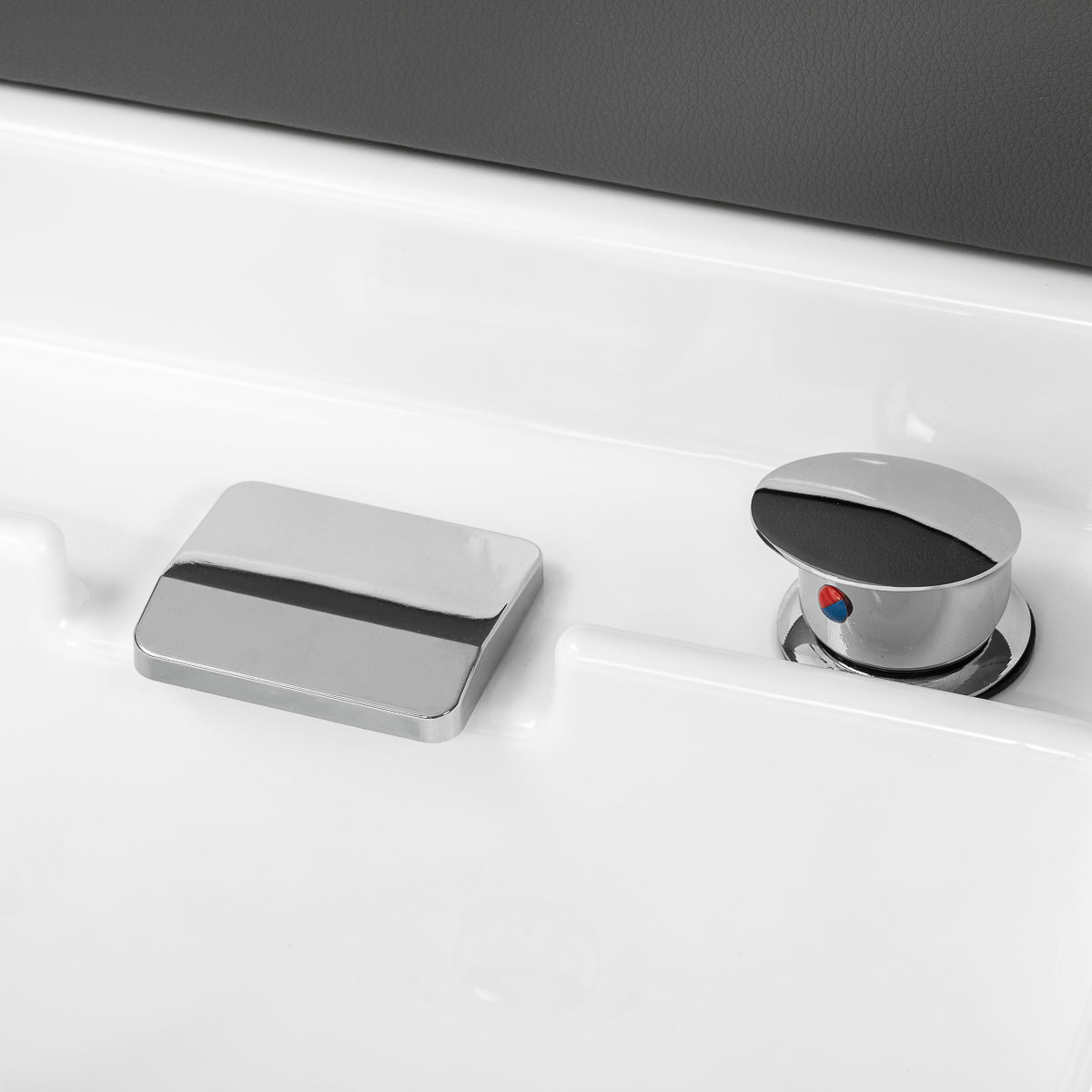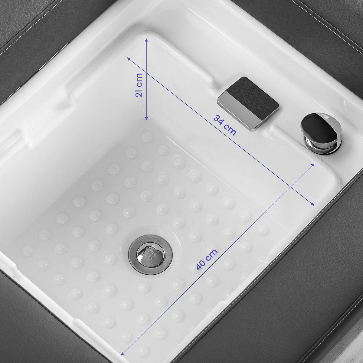 Sügav keraamiline kauss valge toonides vähendab tõhusalt vee ja hooldustoodete pritsimist, tagades töö puhtuse ja mugavuse. Vastupidavast materjalist kauss on vastupidav värvimuutustele, kriimustustele ja kahjustustele ning selle sile pind teeb puhastamise erakordselt lihtsaks. Eriline profiil hõlbustab mitte ainult teenuse osutaja ligipääsu, vaid annab pesuseadmele elegantse ja kaasaegse välimuse. Esteetika ja funktsionaalsuse kombinatsioon tõstab iga professionaalse ruumi taset.