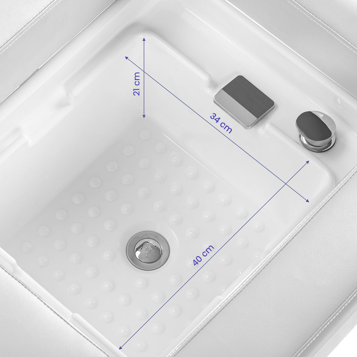 Pesuasemel on segisti, mis võimaldab lihtsat temperatuuri reguleerimist vastavalt kliendi eelistustele. Praktiline koht dušipeale hõlbustab tööd, samas kui erilise filtriga äravool võimaldab vee voolu kontrolli ja säilitab salongi kõrged hügieenistandardid. Veeliitmik asub kausi all sees ja taga dušialuse all, esteetiliselt peites paigalduse. Ergonoomiliselt kujundatud lamamistool tagab mugavuse ja piisava toe hoolduste ajal ning komplektis olev puf suurendab personali mugavust. Funktsionaalsuse ja mugavuse kombinatsioon muudab selle pesuaseme mitmekülgseks varustuseks nii juuksurisalongidele kui ka SPA keskustele.