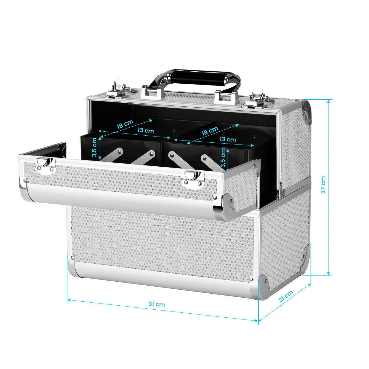 Kaasaegne disain hõbedastes toonides sädelevate aktsentidega lisab elegantse puudutuse. Käepide teeb transpordi lihtsaks, mis on eriti oluline mobiilsetele stilistidele. Valmistatud vastupidavatest, kahjustuskindlatest materjalidest, tagab see igapäevase kasutamise mugavuse. Tugev klambriga sulgur võtmega tagab sisu kaitse ning kerge, vastupidav konstruktsioon teeb koti lihtsasti kaasaskantavaks.