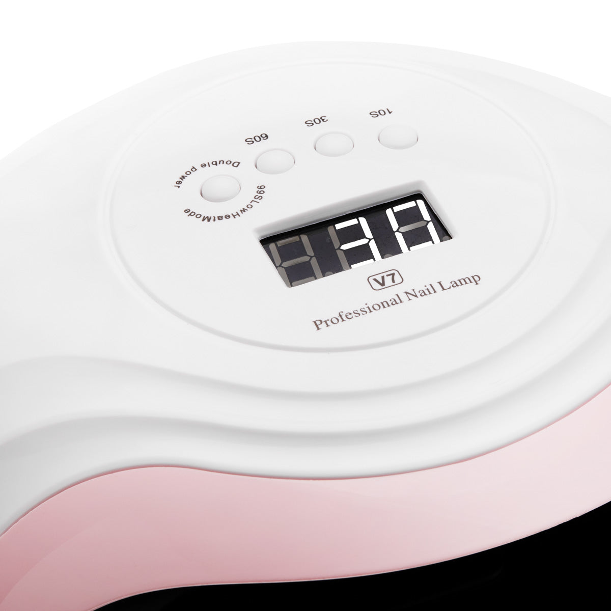 Viimane põlvkond, professionaalne UV / LED-lamp, mis tänu kahe LED-tehnoloogia kasutamisele kõiki geele, hübriidlakkide ja muid valgusega kõvenevaid preparaate kiiresti ja ühtlaselt kõvendab. See kiirgab valget valgust, mis ei väsita silmi. V7 lampil on energiasäästlik kõrge võimsusega valgusallikas ja kahe lainepikkusega 365nm ja 405nm. Lisaks 36 LED-i, mis annavad kokku maksimaalse võimsuse 168W! Lamp on varustatud liikumisanduri, 10, 30, 60 ja 99-sekundilise taimeriga ning pärast anduri aktiveerimist põleb see pidevalt 99 sekundit. 99 sekundi "Madala kuumuse režiim" on režiim, kus lambi võimsus suureneb järk-järgult iga 30 sekundi järel. See vähendab ehitusgeelide pealekandmisel tekkivat põletustunnet. Suur elektrooniline ekraan teeb aja kontrollimise lihtsaks.