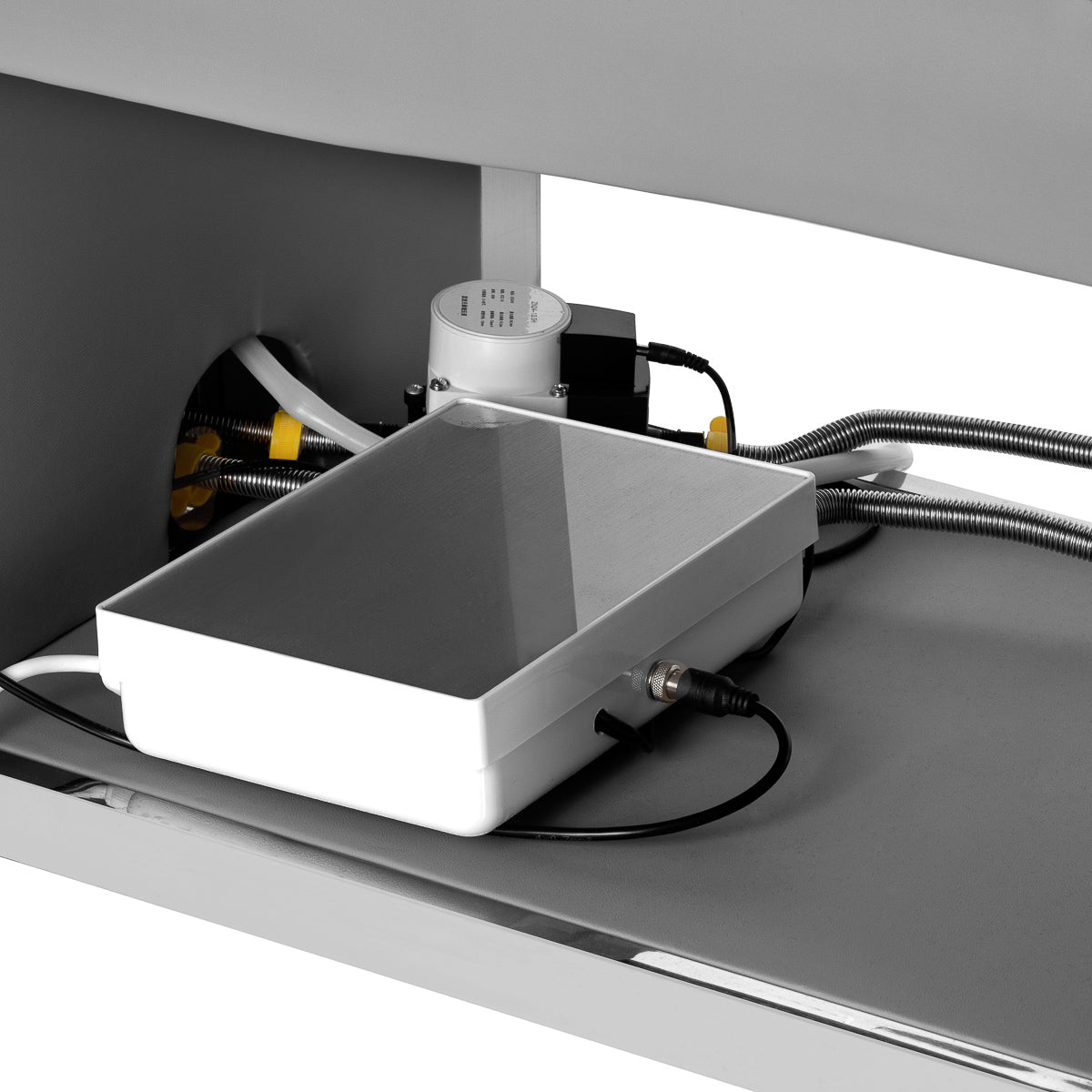 Juuste pesuseade on varustatud segistiga, mis võimaldab lihtsat temperatuuri reguleerimist vastavalt kliendi eelistustele. Dušipea jaoks mõeldud koht lihtsustab tööd ning kroomitud pistik spetsiaalse filtriga võimaldab kontrollida vee voolu ja säilitada kõrged hügieenistandardid salongis. Veeliitmik on paigutatud aluse sisse, mis võimaldab tõhusalt peita kõik torud. Lamamistool on profileeritud nii, et see tagab mugavuse erinevate hoolduste ajal. Funktsionaalsuse ja mugavuste kombinatsioon muudab töö juuksurisalongis või SPA-s veelgi mugavamaks. Komplekt sisaldab ka mugavat pufi, mis tagab personali mugavuse, muutes juuste pesuvoodi veelgi mitmekülgsemaks lahenduseks SPA-salongidele.