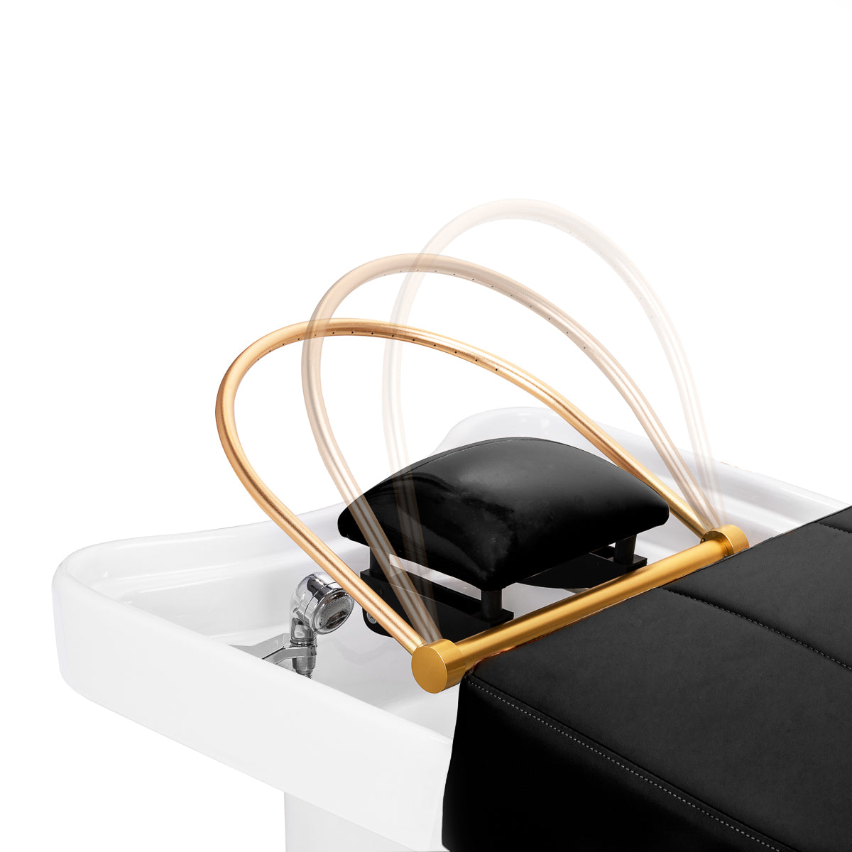 Kuldne kaar reguleeritava kaldenurgaga, mis on mõeldud Waterfall Head SPA jaoks, on innovatiivne lahendus, mis võimaldab holistilist peanaha hooldust. Veejoa massaaž toimib loomuliku massaažina, parandades vereringet, vähendades pinget ja stressi. Täpselt juhitud veevoolud toetavad juuste taastumist ja niisutavad nahka intensiivselt. Reguleeritava kaldenurgaga juga kaar tagab sügava peanaha puhastuse ja lõõgastuse, toob leevendust sellistele vaevustele nagu peavalu või kangestunud kael. Tänu intelligentsele suletud ringluse süsteemile võtab kaar vett kausist ja kasutab seda uuesti, pakkudes katkestamatut veemassaaži. See on tehnoloogia ja lõõgastuse kombinatsioon, mis toetab juuste tervist ja heaolu.