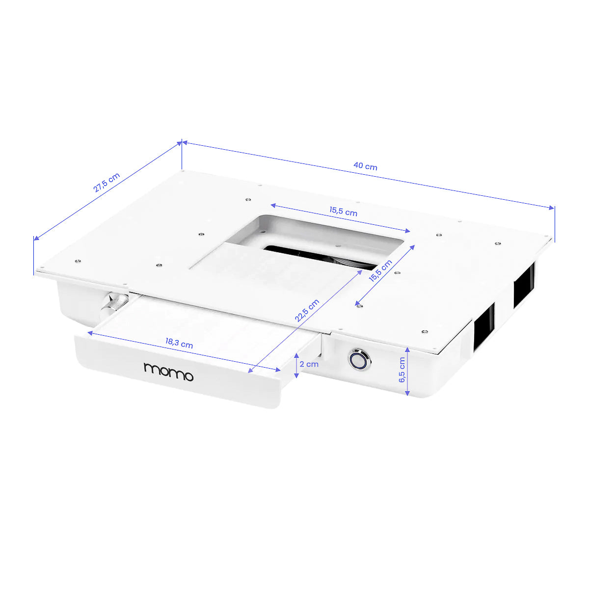 Momo J-02 kassett-tolmuimeja, mis on integreeritud tööpinna sisse, parandab oluliselt töö mugavust ja hügieeni, eemaldades tõhusalt tolmu, mis tekib iluprotseduuride, näiteks maniküüri ajal. Tänu sellele seadmele jääb salongi õhk puhtaks ja töökeskkond saastest vaba, mis suurendab nii iluteenindaja kui ka klientide ohutust. Tolmuimeja on lihtne kasutada ja hooldada, mis lisaks parandab selle funktsionaalsust. Regulaarne puhastamine ja filtrite vahetamine tagavad pidevalt kõrge imemisvõime. On võimalik osta lisafiltreid (SKU 123581).