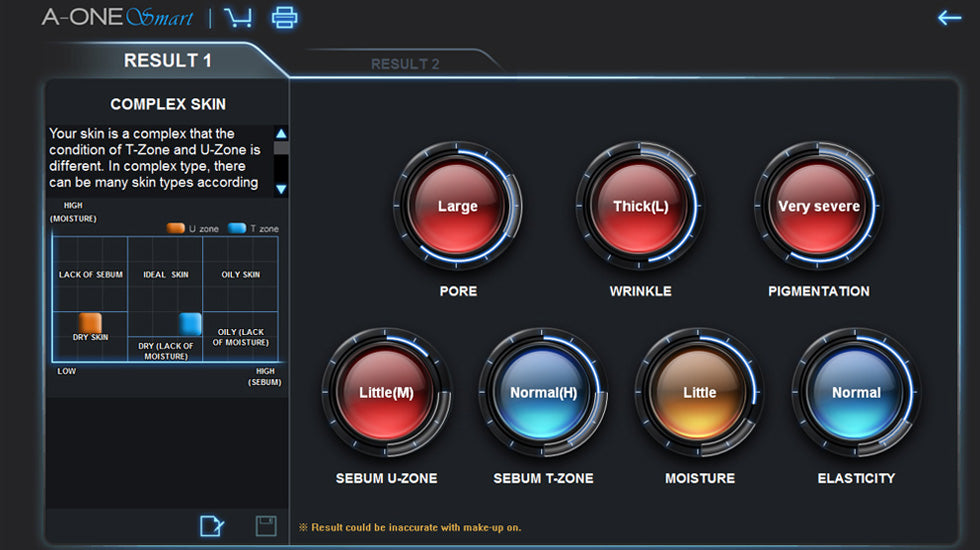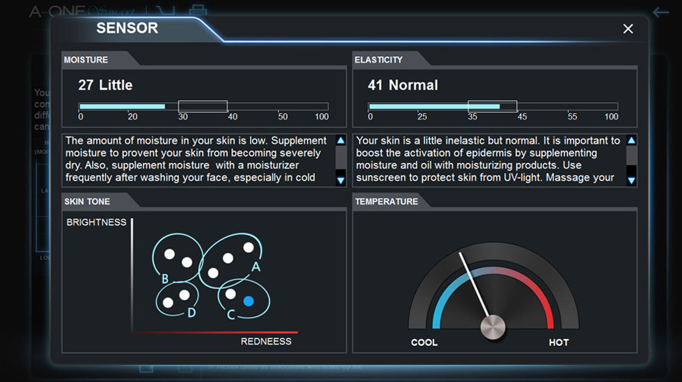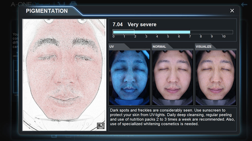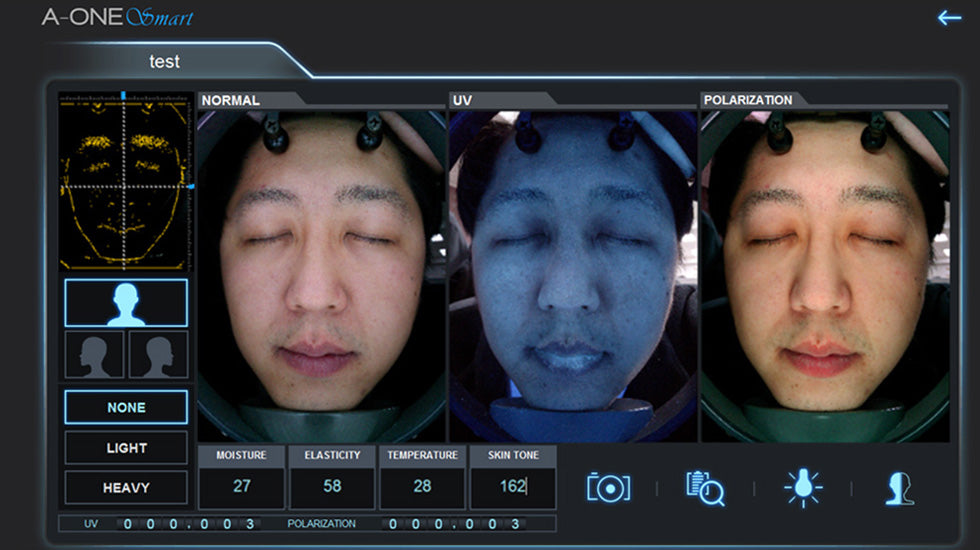 Ühe klõpsuga toimimise abil pakub A-ONE Smart täisnäo analüüsi patenteeritud tehisintellekti näotuvastuse, mitmespektrilise valgustuse (normaalne, UV ja polariseeritud) ning kõrge lahutusvõimega pildistamise abil. See võimas süsteem mõõdab kaheksat olulist naha mõõdikut—poori suurus, rasu, kortsud, pigmendid, nahatooni, temperatuuri, niiskust ja elastsust—võimaldades täpseid ja reaalajas hinnanguid.