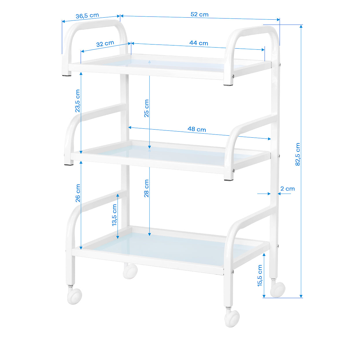 Vastupidavast alumiiniumist raam valge toonides ja klaasriiulid moodustavad kaasaegse ja esteetilise terviku, mida on lihtne puhtana hoida. Neli ratast tagavad liikuvuse töökoha lihtsaks korraldamiseks, samas kui tugevad materjalid kindlustavad stabiilsuse ja pikaajalise kasutuse.