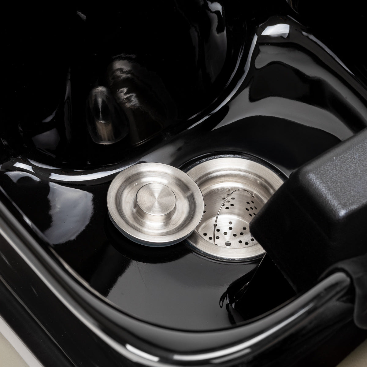 Keraamiline kauss mustades toonides, oma kaasaegse kujuga ja sobiva sügavusega, takistab tõhusalt vee ja hoolduste käigus kasutatavate toodete pritsimist, võimaldades mugavat ja tõhusat laia teenuste valiku teostamist. Õigesti kujundatud krae ja kaldu seljatugi tagavad juuste pesemisel mugavuse ja toe, samas kui must plastikust kate kaitseb klienti külma keraamilise pinna eest, tagades meeldiva kogemuse hoolduse ajal.