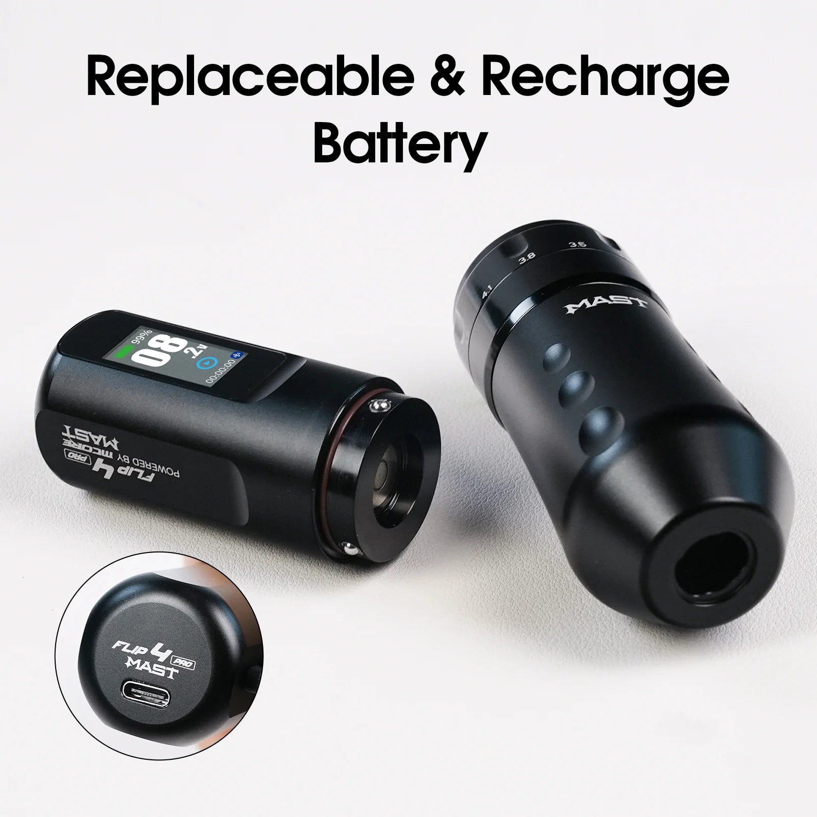 Varustatud Mast Safe Tech tehnoloogiaga tagab Flip 4 Pro stabiilse väljundi, pideva aku kaitse ja kiire laadimise. 8V juures võib masin töötada kuni 7 tundi, samas kui täislaadimine võtab aega vaid 1,5 tundi USB-C kaudu. Komplektis on lisaku, mis võimaldab pikki tätoveerimisseansse ilma seisakuteta, säilitades ühtlase jõudluse 4–12V töövahemikus.
