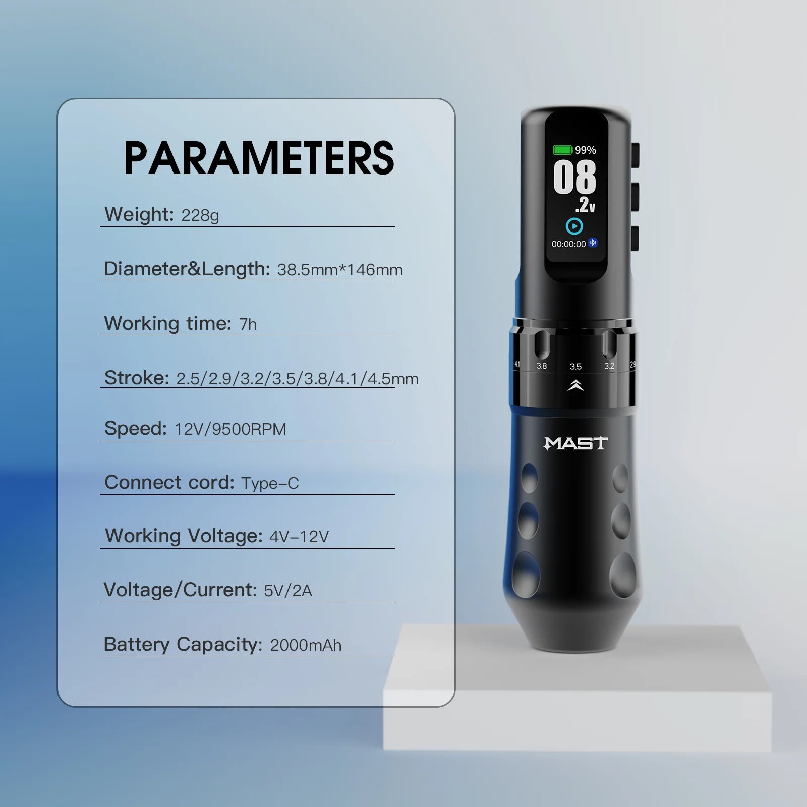 Kõrge jõudlusega traadita tätoveerimispliiatsimasin, mis on loodud nõudlikuks professionaalseks tööks, sisaldades 7 reguleeritavat löögipikkust kuni tõelise 4,5 mm-ni, võimsat Mcore-C1.1 mootorit ja pikaajalist kahetaktilist aku tuge katkestusteta tätoveerimisseansside jaoks.