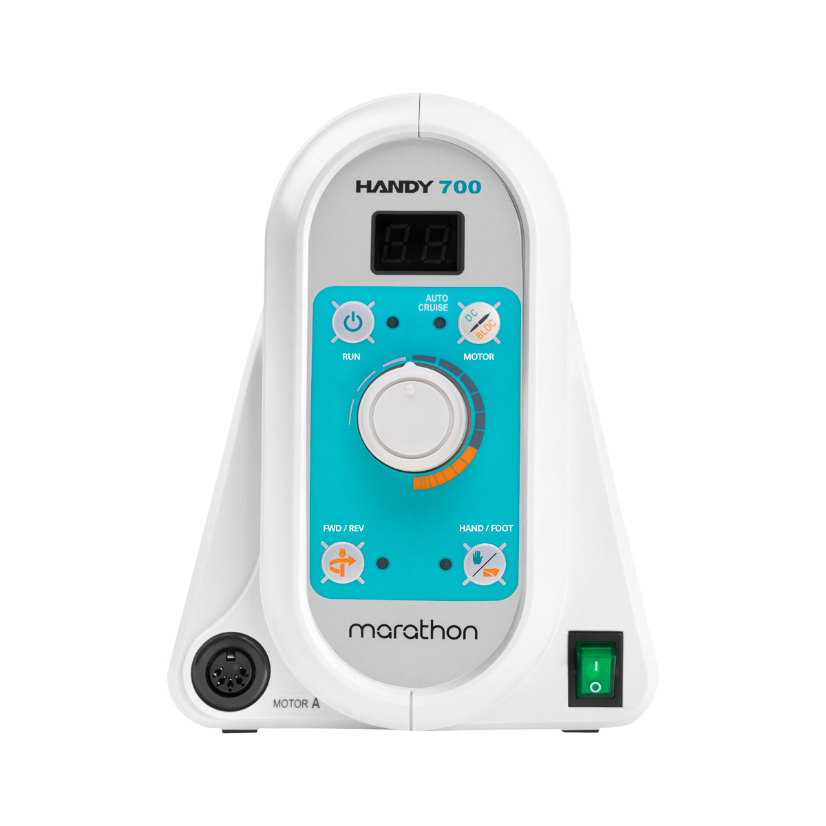 Handy 700 proteesiküünetrell pakub kõrget võimsust 100W ja vaikset tööd. See võimaldab kõrget kiirust kuni 50 000 pööret minutis. Selle küünetrelliga töötamine on äärmiselt mugav, kuna käepideme mikromootorisse on ehitatud mürasummutus süsteem, mis vähendab müra 20% võrra võrreldes tavapäraste mudelitega. Masina juhtimiskast on ergonoomilise kujuga, sellel on praktiline käepide transportimiseks & käepideme hoidja.