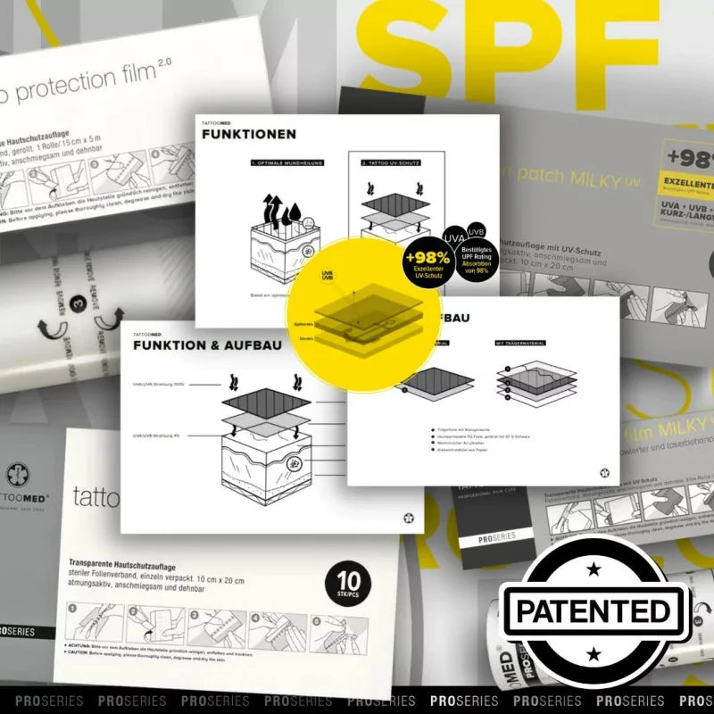 Värskelt tätoveeritud nahal puudub loomulik kaitsebarjäär, mistõttu on see kohe pärast stuudiost väljumist väga vastuvõtlik päikesepõletusele ja rakkude kahjustustele. TattooMed Protection UV Film MILKY toimib usaldusväärse kilbina, takistades kahjuliku UV-kiirguse naha tungimist ja toetades optimaalset paranemist. Kile kaitseb ka saastumise, kuivuse, mikroobide ja tekstiilipõrutuse eest, säilitades niiske haavakliima, mis kiirendab taastumist ja vähendab armistumist.
