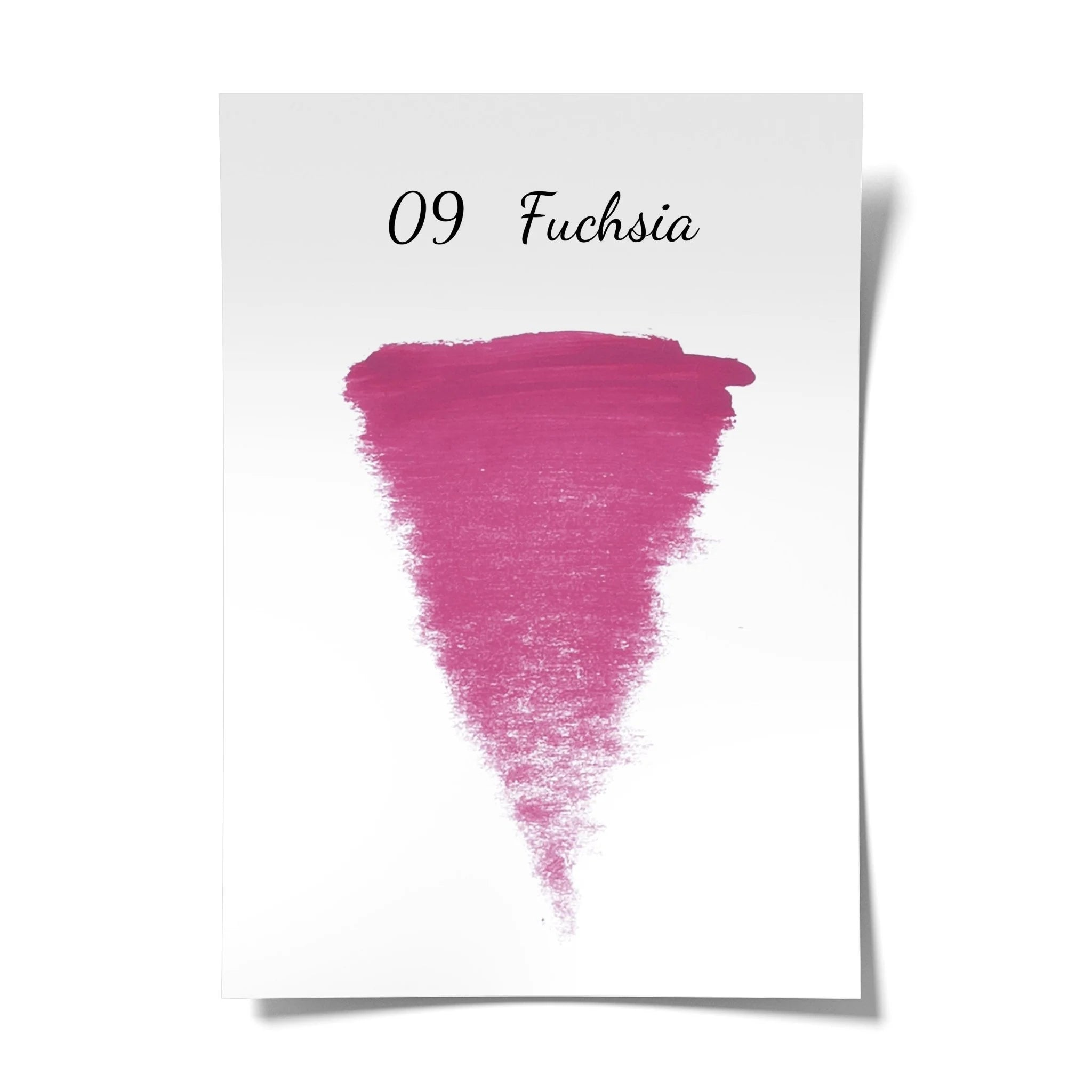 09 Fuchsia ir vēss hibrīda lūpu pigments ar izteiktu rozā–fuksijas apakštoni. Šis tonis izskatās enerģisks un svaigs, piešķirot lūpām spilgtu mirdzumu, nezaudējot dabiskumu. Ideāli piemērots klientēm, kuras vēlas modernu akcentu vai vēlas līdzsvarot siltus un neitrālus lūpu apakštoņus.