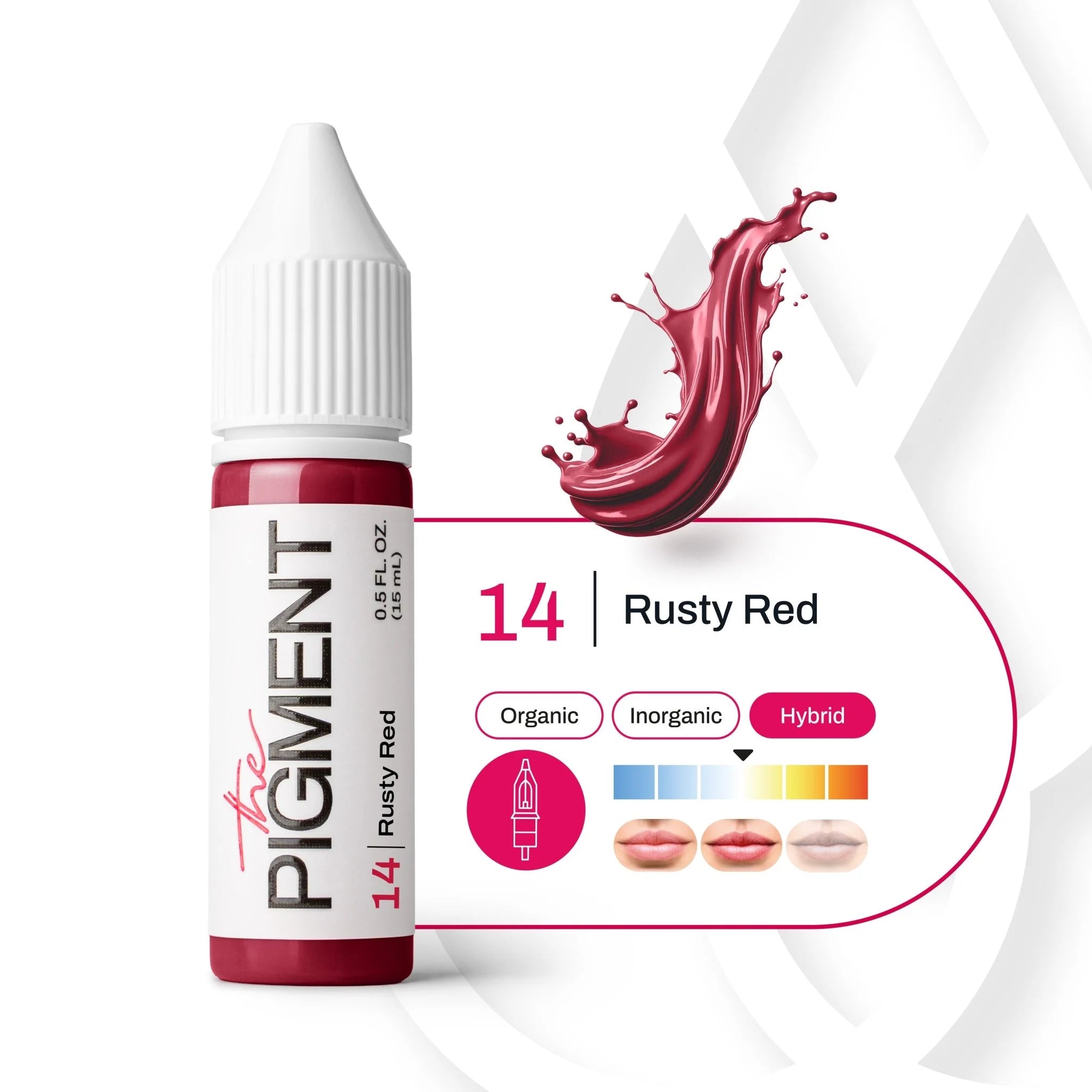 14 Rusty Red on soe hübriidne huulepigment maalähedase punase tooniga, mida inspireerib terrakota loomulik soojus. See toon annab kindla, rikkaliku punase tulemuse pehme rustikaalse iseloomuga – ideaalne PMU kunstnikele, kes loovad väljendusrikkaid, kuid loomulikult tasakaalus huuli.