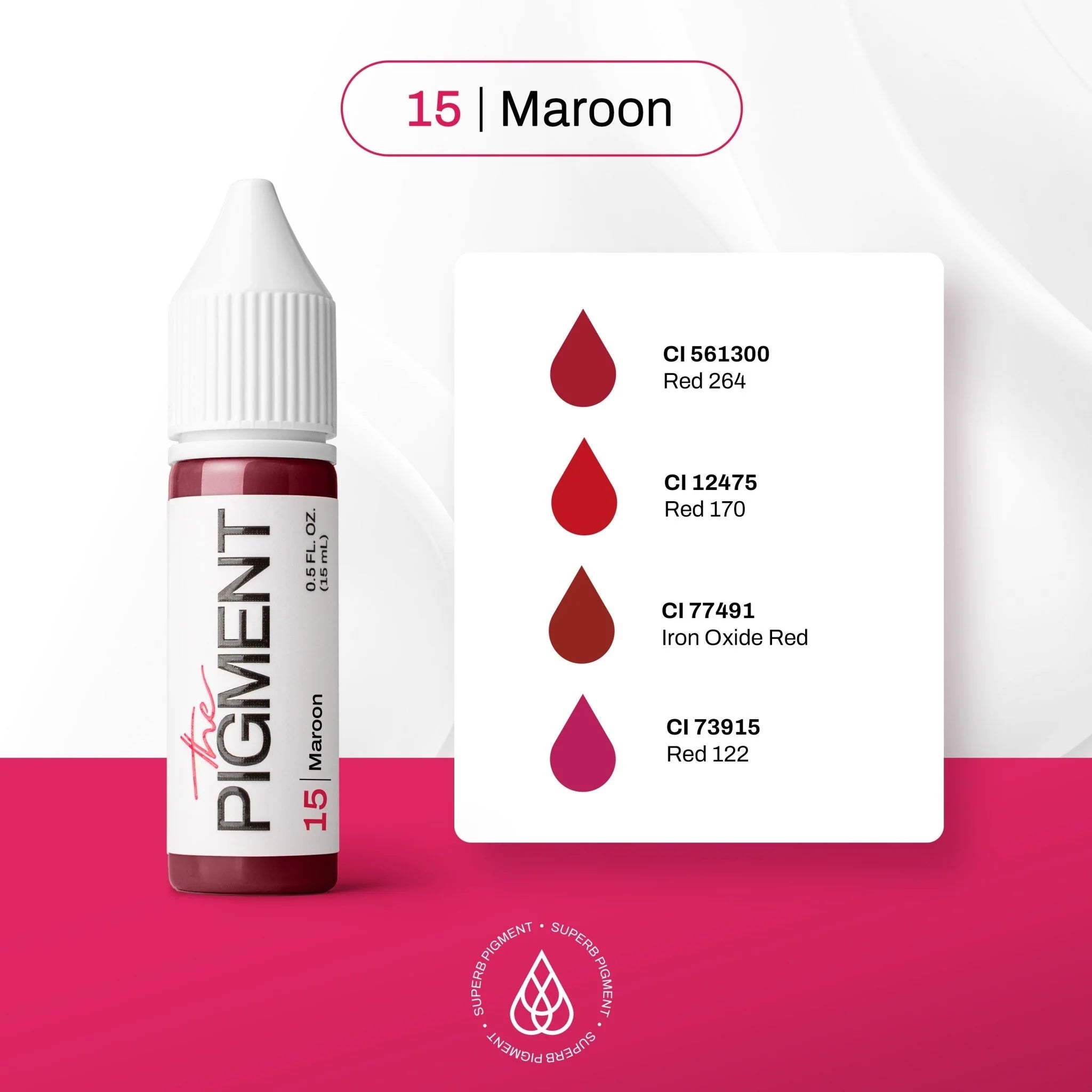 The Pigment 15 Maroon on sügav, soe hübriidne huulepigment elegantse maroon–burgundi iseloomuga. Toon mõjub rikkalikult, ühtlaselt ja pehmelt tasakaalus, pakkudes PMU kunstnikele võimalust luua väljendusrikkaid, kaunilt viimistletud huuli. Värv jääb soojast veinipunast kuni klassikalise maroonini, andes tulemusele ajatu ja luksusliku ilme nii õrnadele kui ka tugevamatele huulestiilidele.